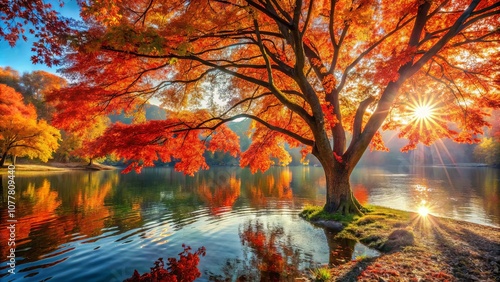 A solitary tree, its branches ablaze with vibrant autumn hues, stands sentinel by a tranquil lake, the sun's rays illuminating the scene with golden warmth.