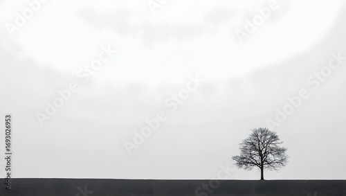 A solitary tree stands against a stark white background in a minimalist landscape scene
