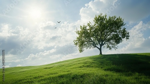 A solitary tree stands on a lush green hill under a bright blue sky with clouds and birds in the distance.