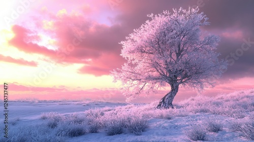 A solitary tree with frosted pink branches stands amidst a vast,