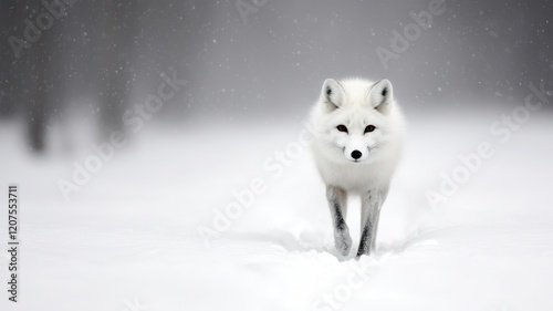 A solitary white fox walks through a snowy landscape, surrounded by a soft, blurred background of falling snowflakes.