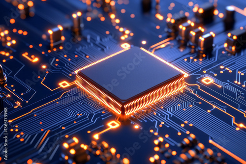 A sophisticated and realistic depiction of a microcontroller chip with a cube-shaped core and