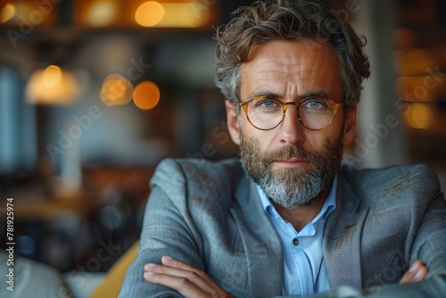 A sophisticated businessman with gray hair and beard looking serious and thoughtful