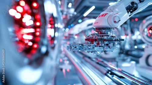 A sophisticated robotic arm is engaged in assembling delicate electronic circuits inside a modern manufacturing facility. The atmosphere is filled with vibrant lights