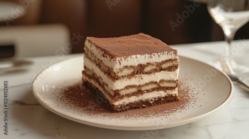 A sophisticated Tiramisu cake slice served on a white plate, with visible layers of cream and coffee sponge, elegantly topped with a dusting of cocoa powder, perfect for fine dining.