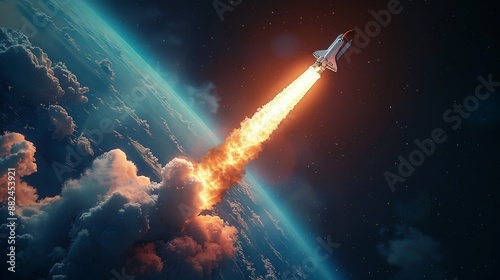 a space shuttle launch showing the rocket's ascent with a trail of fire and smoke