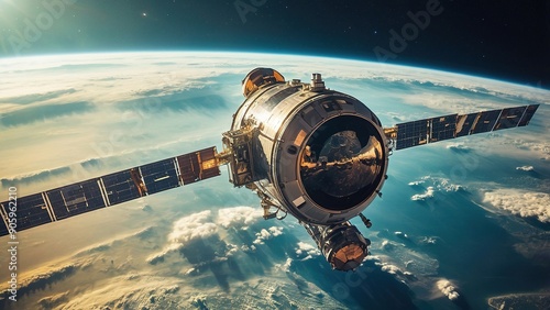 A spacecraft orbits Earth, showcasing its exterior with solar panels. White clouds and a blue ocean are visible below, highlighting the vastness of space.