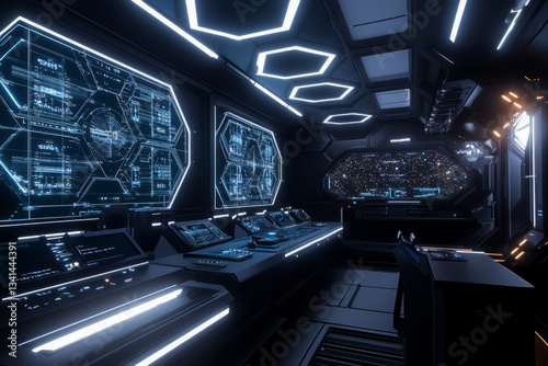 A spaceship control room with an advanced hexagonal holographic navigation system. The glowing digital star charts, floating AI-driven waypoints, and futuristic user interface create a highly