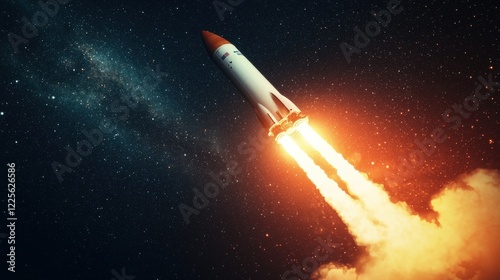 A SpaceX rocket captured during a night launch, its fiery engines illuminating the darkness as it ascends through a starry sky, the glow of the exhaust plume creating a dramatic contrast against the