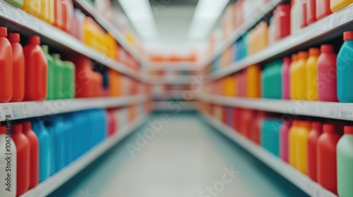 A spacious and well organized supermarket household section showcasing an abundant selection of disinfectants sanitizers and other cleaning supplies with a captivating depth of field effect