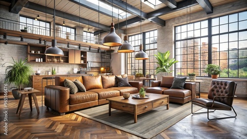 A spacious loft apartment features a calming neutral color scheme, complemented by warm wood tones and rich leather