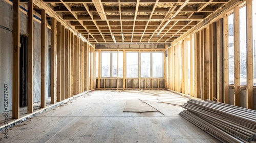 A spacious, unfinished room with exposed wooden beams and exposed ceiling beams, featuring a large window with white frames and a view of a snowy landscape outside.