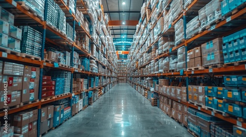 A spacious warehouse filled with neatly organized shelves stacked with diverse packages and boxes during daylight