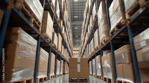 A spacious warehouse filled with neatly stacked pallets of boxes, showcasing an organized storage environment.