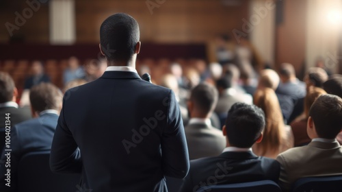 A speaker faces an attentive audience seen from behind, capturing the dynamic interaction and engagement in a professional setting.