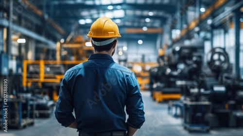 A specialist in a hard hat walking towards large industrial presses and metal forging machines in a state-of-the-art manufacturing facility