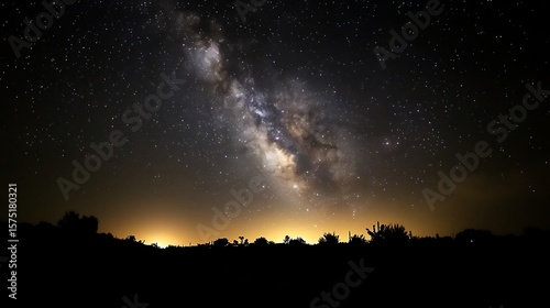 A spectacular view of the Milky Way stretching across a crisp, clear night sky above a secluded forest with no light pollution.