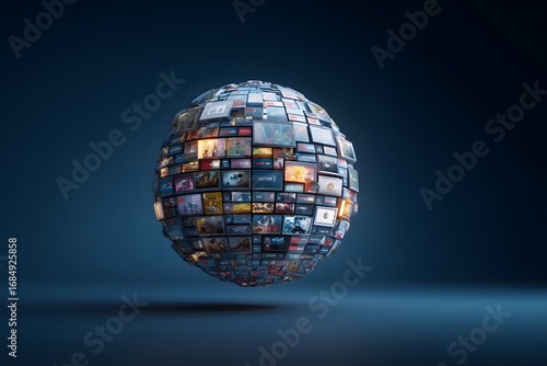 A sphere composed of multiple floating images of digital media and technology, set against a blue background with dark tones,