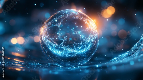 A spherical liquid droplet with molecular chains inside, floating over an abstract DNA helix glowing in blue hues