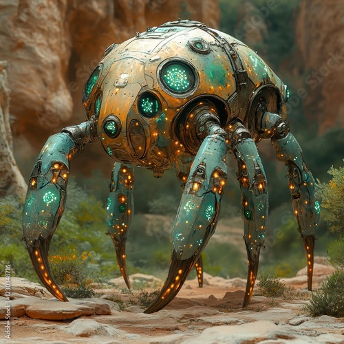 A spherical, metallic insect-like robot with multiple legs and sharp claws is depicted against a rocky landscape Its exterior shows both mechanical components and bluegreen internal l - AI-generated