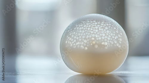 A spherical ravioli created using molecular gastronomy, with a thin edible membrane filled with a flavorful liquid that bursts in your mouth