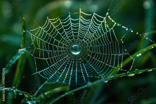 A spiderweb glistening with morning dew, a perfect orb of water at its center.