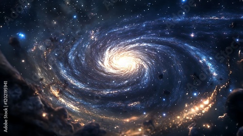 A spiral galaxy visible from a hilltop with the night sky filled with the light of countless stars