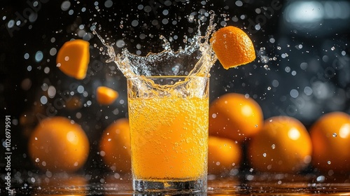 A splash of orange juice captured mid-air as it hits the surface of a glass, with oranges in the background