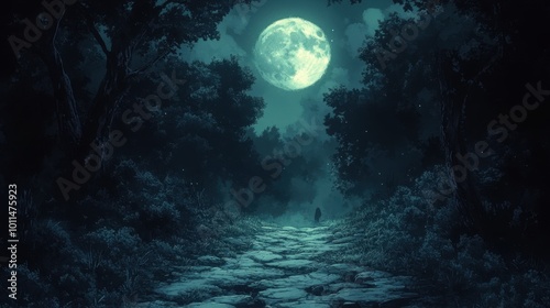 A spooky forest path lit by moonlight, with a cartoon character walking cautiously as shadows stretch long and eerie around them