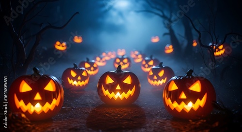 A spooky halloween night with glowing jack olanterns lining a path through a dark forest, creating a scary and festive atmosphere