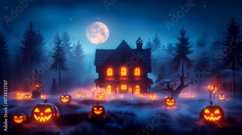 a spooky Halloween setting with a haunted house, glowing pumpkins, and swirling fog, with dark trees silhouetted against the moonlight, providing ample copy space for text