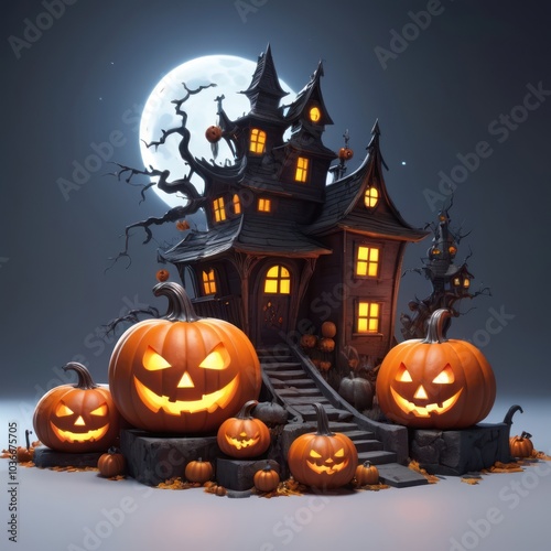 A spooky haunted house with glowing windows and jack-o-lantern pumpkins on a dark night with a full moon.