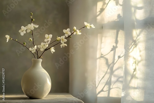 A sprig of wintersweet is placed in a vase, with soft petals and a gentle background