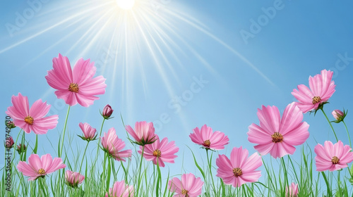 "A spring background featuring vibrant flowers, bathed in the warm glow of the sun, creating a fresh and serene atmosphere."