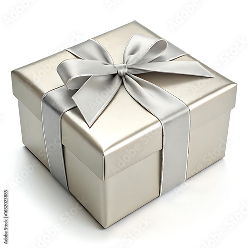 A square gift box in silver color with a matching ribbon and bow on a white surface in a studio shot