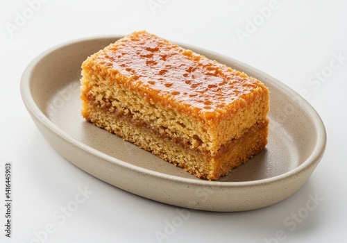 A square slice of caramel cake on a light beige plate against a plain white studio background view