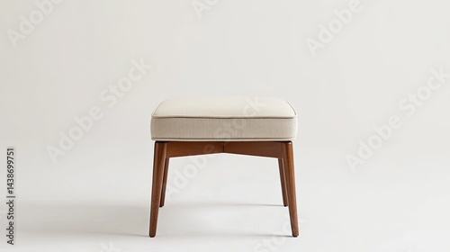 A square wooden stool with a soft beige upholstered seat and mid-century-inspired tapered legs