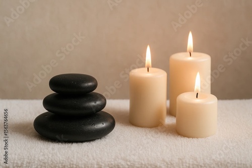 A stack of black pebbles and three white candles on a white towel
