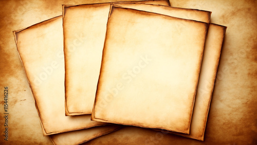 A stack of blank vintage paper sheets placed on a rustic grunge backdrop, blending historical charm with timeless simplicity. High-resolution detail enhances every layer.