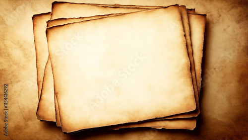 A stack of blank vintage papers layered on an aged background with a sepia tone, offering an old-world charm for creative projects or designs. The rustic textures evoke history and nostalgia.