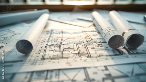 A stack of blueprints with a sun shining on them. Scene is calm and focused