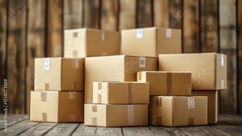 A stack of cardboard boxes on a wooden table with a wooden background.