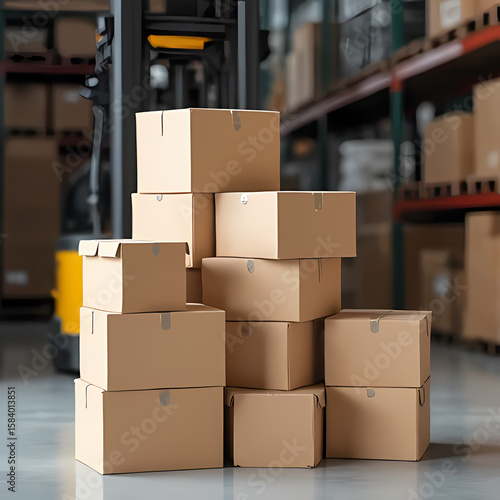 A stack of cardboard shipping boxes in a warehouse with forklift in the background
