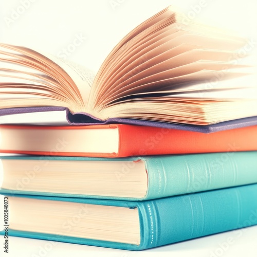 A stack of colorful books with one open, showcasing knowledge and reading.