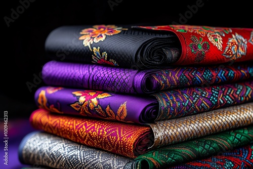 A stack of colorful Thai silk fabrics, each piece glowing with shades of purple, red, and emerald, with intricate floral and geometric patterns woven into the material.