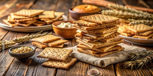 A stack of crispy crackers on a rustic wooden table, surrounded by bowls of ingredients and wheat stalks, suggesting the process of baking.