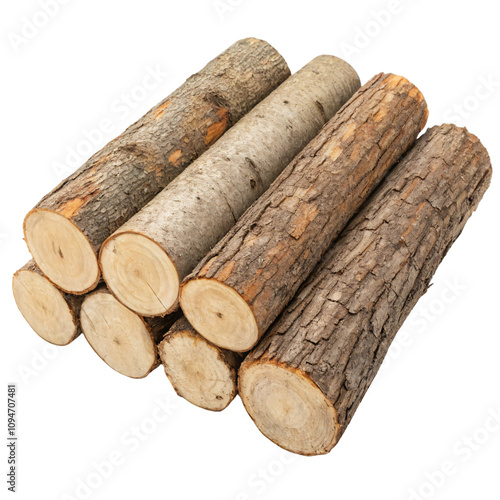 A stack of cut logs with varied bark textures, emphasizing natural earth tones and patterns, set against a transparent background