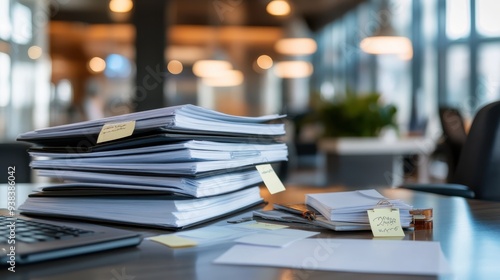 A stack of documents and notebooks are on a wooden desk in an open office with modern decor, captured in a bright and organized work environment.
