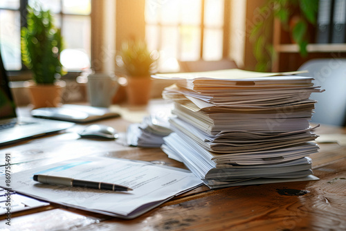 A stack of documents on a wooden desk with a pen, in a sunlit home office environment with potted plants in the background.