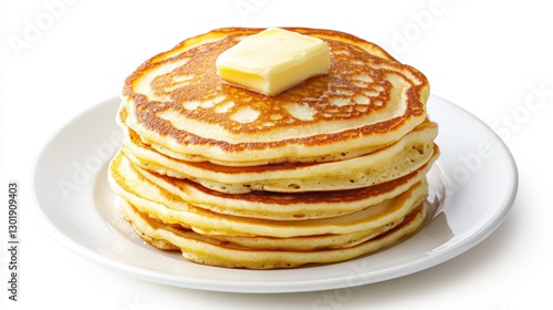 A stack of fluffy pancakes topped with a pat of butter, served on a white plate, perfect for breakfast or brunch.